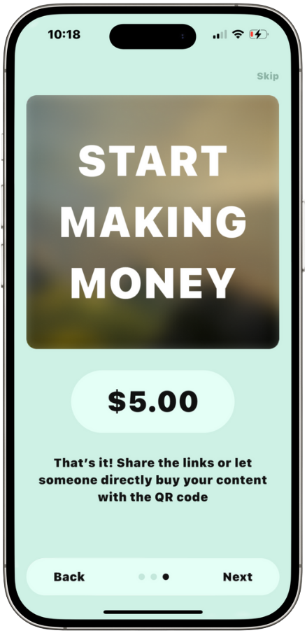 Create revenue in just one click. Upload your photos, videos, or PDFs and share a single link anywhere — Telegram, X (Twitter), Instagram, WhatsApp, and more. Followers pay, download instantly. No hassles. No waiting.